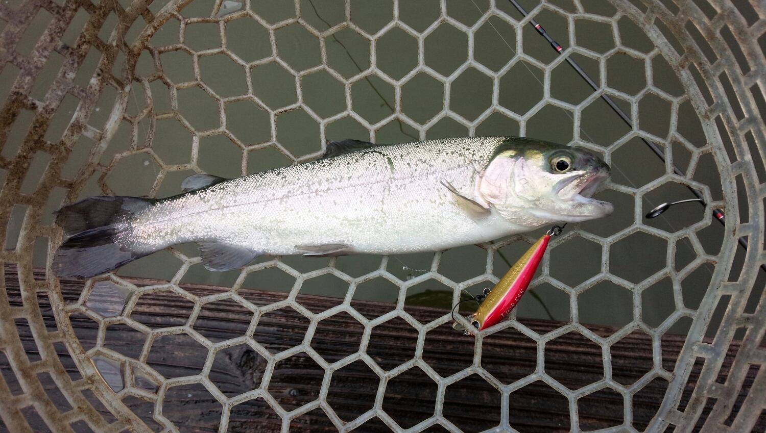 早速、頂いたミノーを投げて泳ぎを見ながら表層でチョコチョコやっているとググッとヒット!
