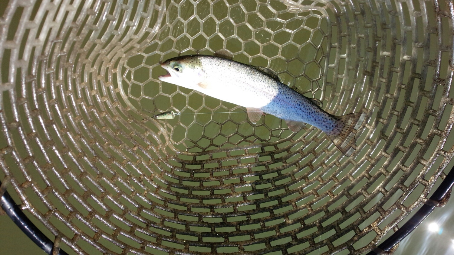 ルアーを流れにキャストして、流れにルアーを流すようにゆっくり引いていると、「コン!」っとはっきりしたアタリ!